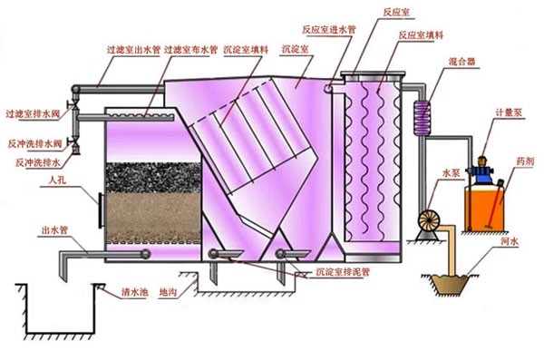 一體化凈水設(shè)備和城市供水廠的凈化流程一樣,它有混凝池、沉淀池、過濾池、水質(zhì)穩(wěn)定裝置、反沖洗裝置、水泵及電氣控制。
