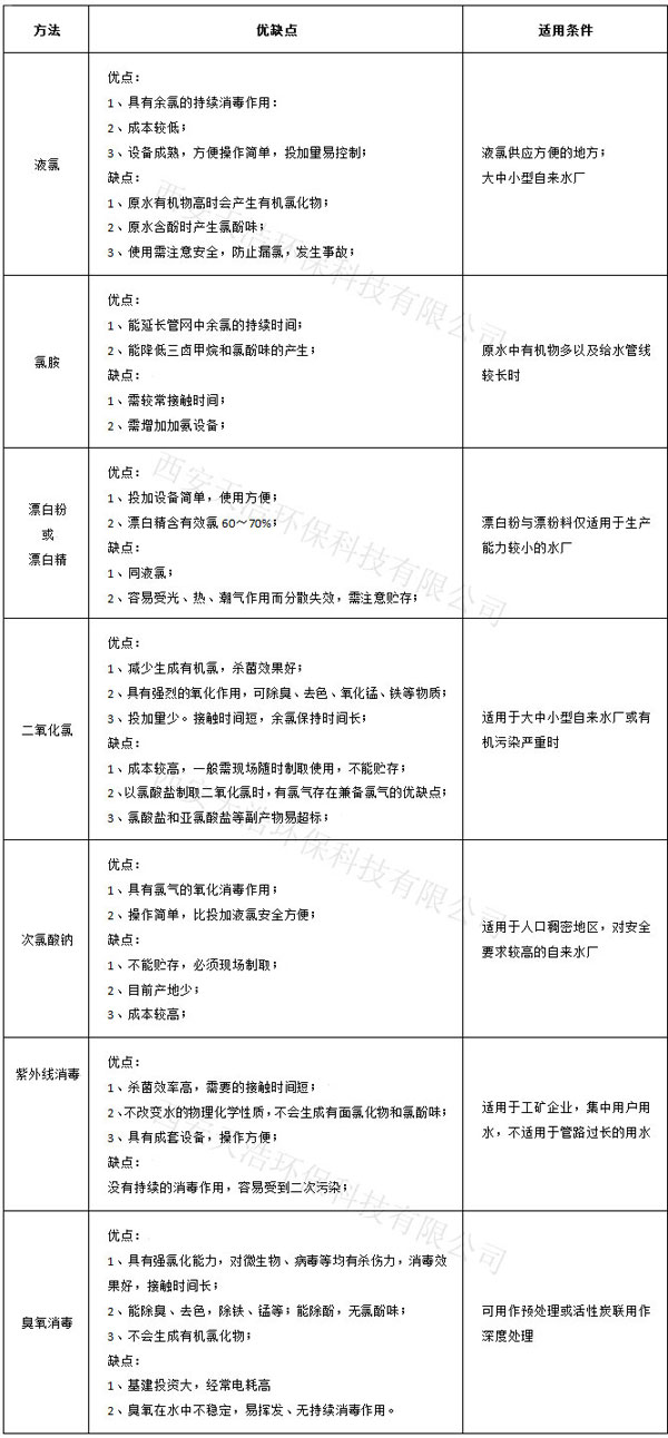 目前自來水廠普遍采用氯和氯胺消毒、二氧化氯消毒。現(xiàn)將這些自來水廠常用的消毒方法優(yōu)缺點及適用條件見下表: